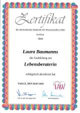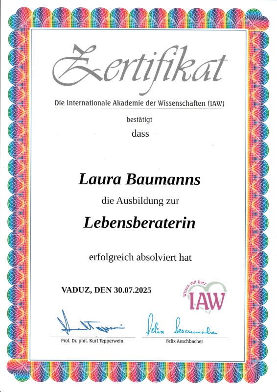 Laura hat den Grundlehrgang und die Ausbildung zur Lebensberaterin erfolgreich absolviert.